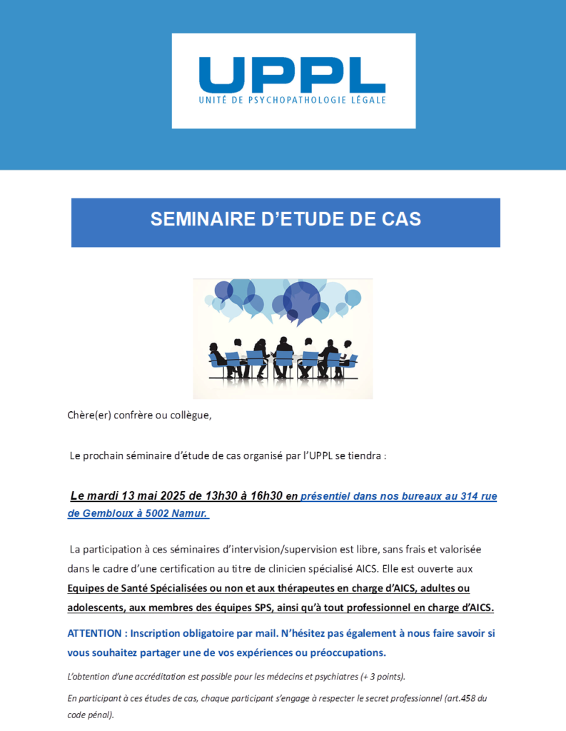 Le 13 mai après-midi à Namur, l’unité de psychopathologie légale (UPPL) organise un séminaire d’étude de cas. Ce séminaire est ouvert à tous professionnels en charge d’Auteurs d’Infraction(s) à Caractère Sexuel (AICS).